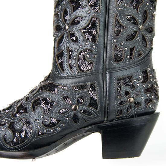 Show stopper boots right here by Corral boots. These black boots are detailed with a floral cut design and a sequinned in lay. The studs of the boots are perfectly placed to give emphasis to the flowers.Leather: Cowhide